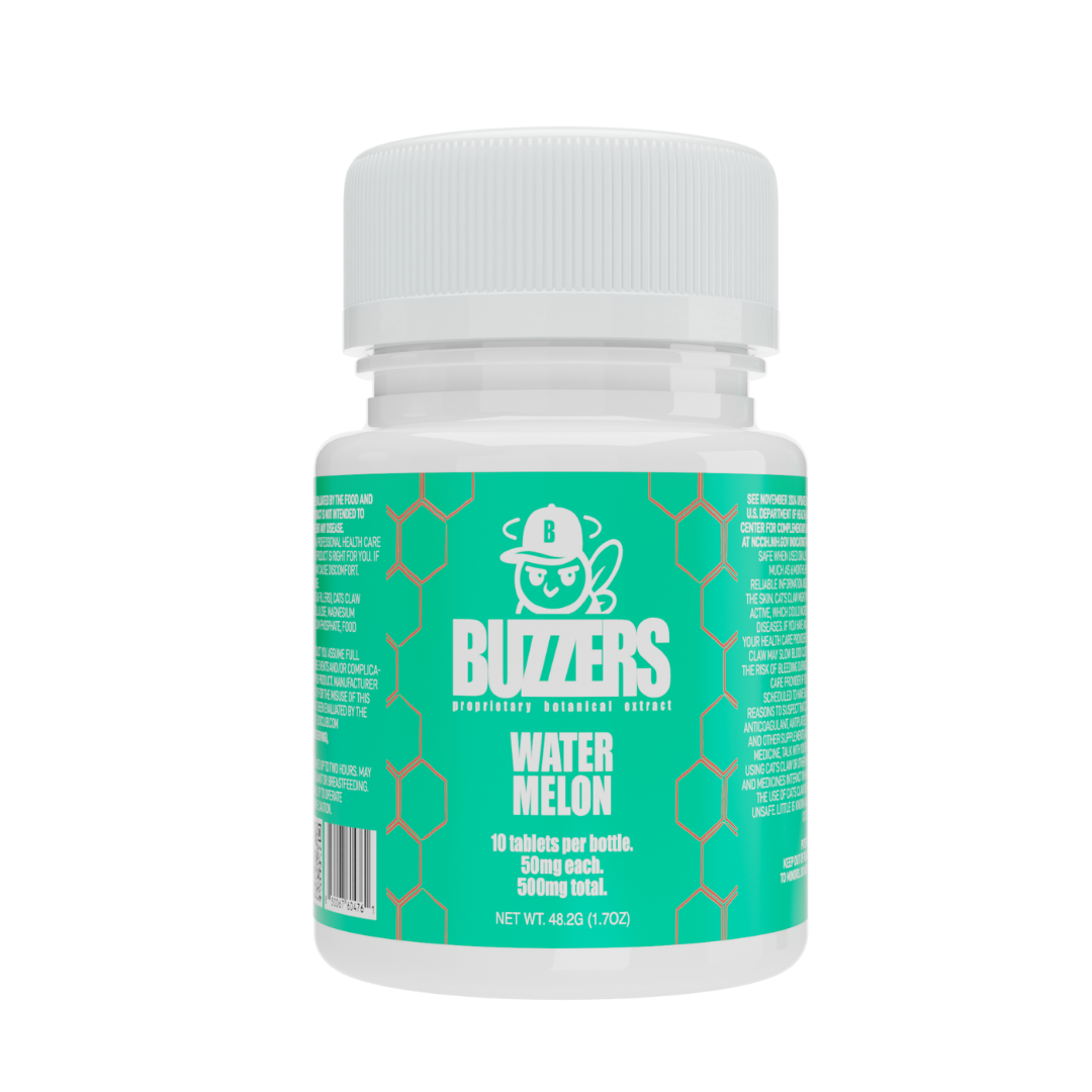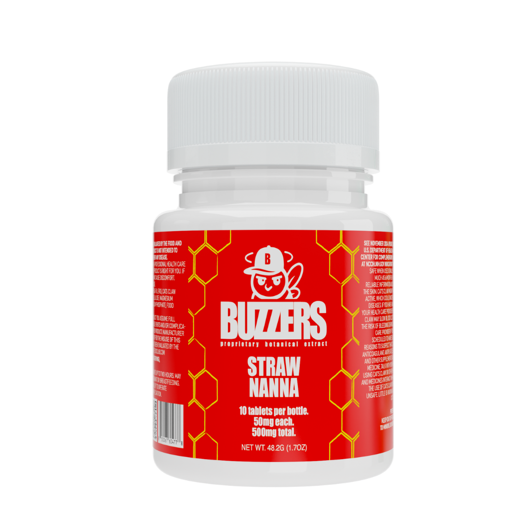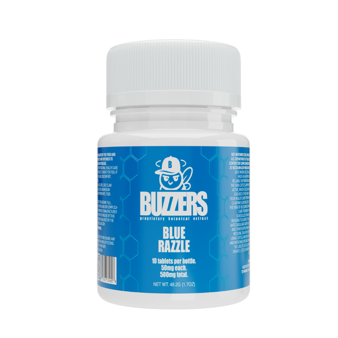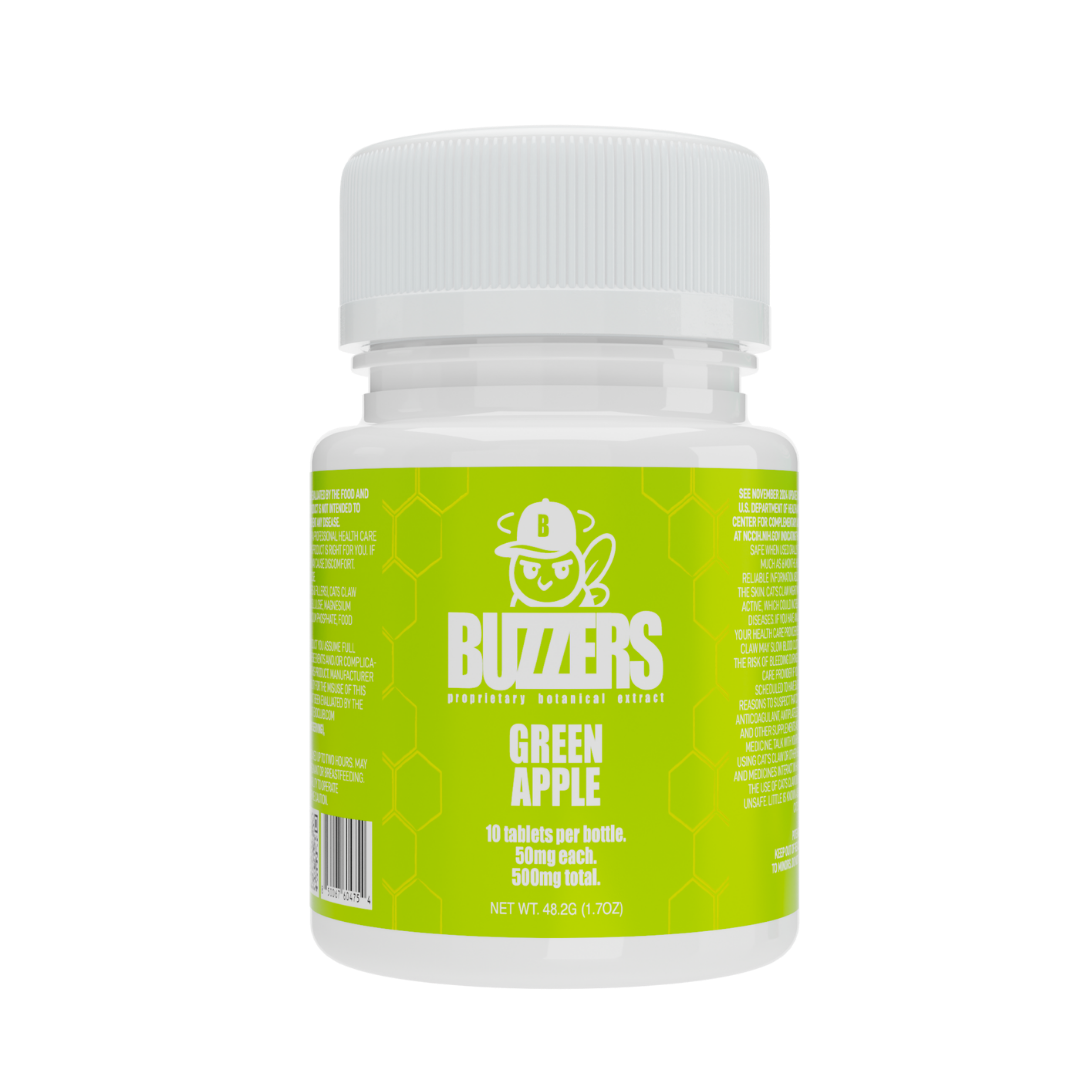 Buzzers 500mg Botanical Extract Tablets formulated with a proprietary blend of plant-derived extracts, delivering 50mg per tablet, with 10 tablets per bottle.